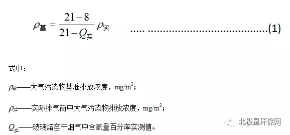 1.4 對于玻璃熔窯排氣(純氧燃燒除外),應同時對排氣中含氧量進行監測,實測排氣筒中大氣污染物排放濃度應按式(1)換算為含氧量為8%狀態下的基準排放濃度,并以此作為排放是否達標的依據。其他車間或生產設施排氣按實測濃度計算,但不得人為稀釋排放。