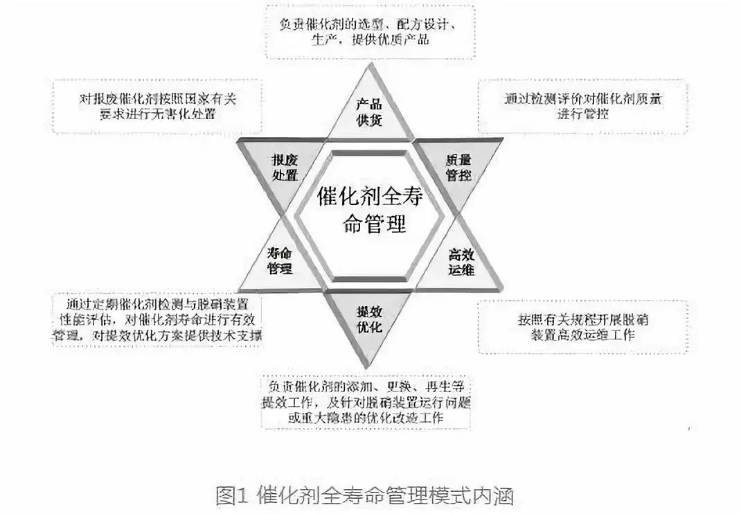 針對(duì)當(dāng)前SCR脫硝催化劑應(yīng)用現(xiàn)狀及存在問題,催化劑全壽命管理不僅應(yīng)確保催化劑采購成本的集約化,還應(yīng)包括對(duì)脫硝裝置的高效性能管控,在此基礎(chǔ)上實(shí)現(xiàn)脫硝裝置的可靠、高效、經(jīng)濟(jì)運(yùn)行,因此催化劑全壽命管理模式應(yīng)涵蓋催化劑全壽命周期的產(chǎn)品供貨、質(zhì)量管控、高效運(yùn)維、提效優(yōu)化、壽命管理以及報(bào)廢處置六個(gè)部分。同時(shí)催化劑全壽命管理不僅以發(fā)電企業(yè)為主體單位,還應(yīng)包括催化劑廠商與第三方技術(shù)服務(wù)單位作為責(zé)任單位,通過明確各方責(zé)任,充分發(fā)揮各方專業(yè)特長,發(fā)電企業(yè)能夠獲得質(zhì)量穩(wěn)定可靠的催化劑產(chǎn)品與優(yōu)質(zhì)高效的技術(shù)服務(wù),減少催化劑采購成本與運(yùn)維成本,實(shí)現(xiàn)催化劑全壽命管理的效益最大化。